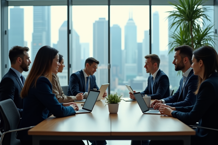 Groupe de professionnels en réunion dans un bureau moderne avec vue urbaine futuriste